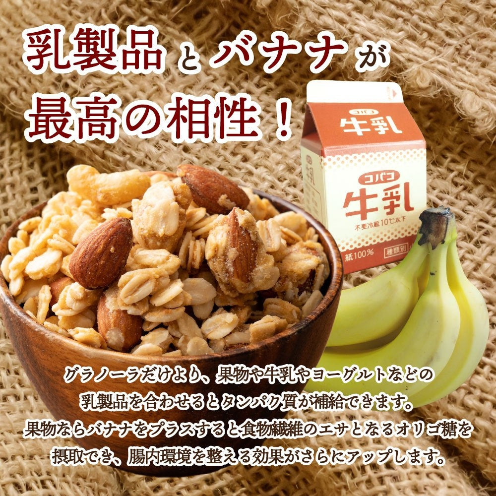 ヨーグルトや牛乳をかけて朝食としたり、おやつとしてそのまま食べたり軽くて持ち運びやすく、栄養素が高い為、キャンプやハイキングの携帯食にも向いてます。