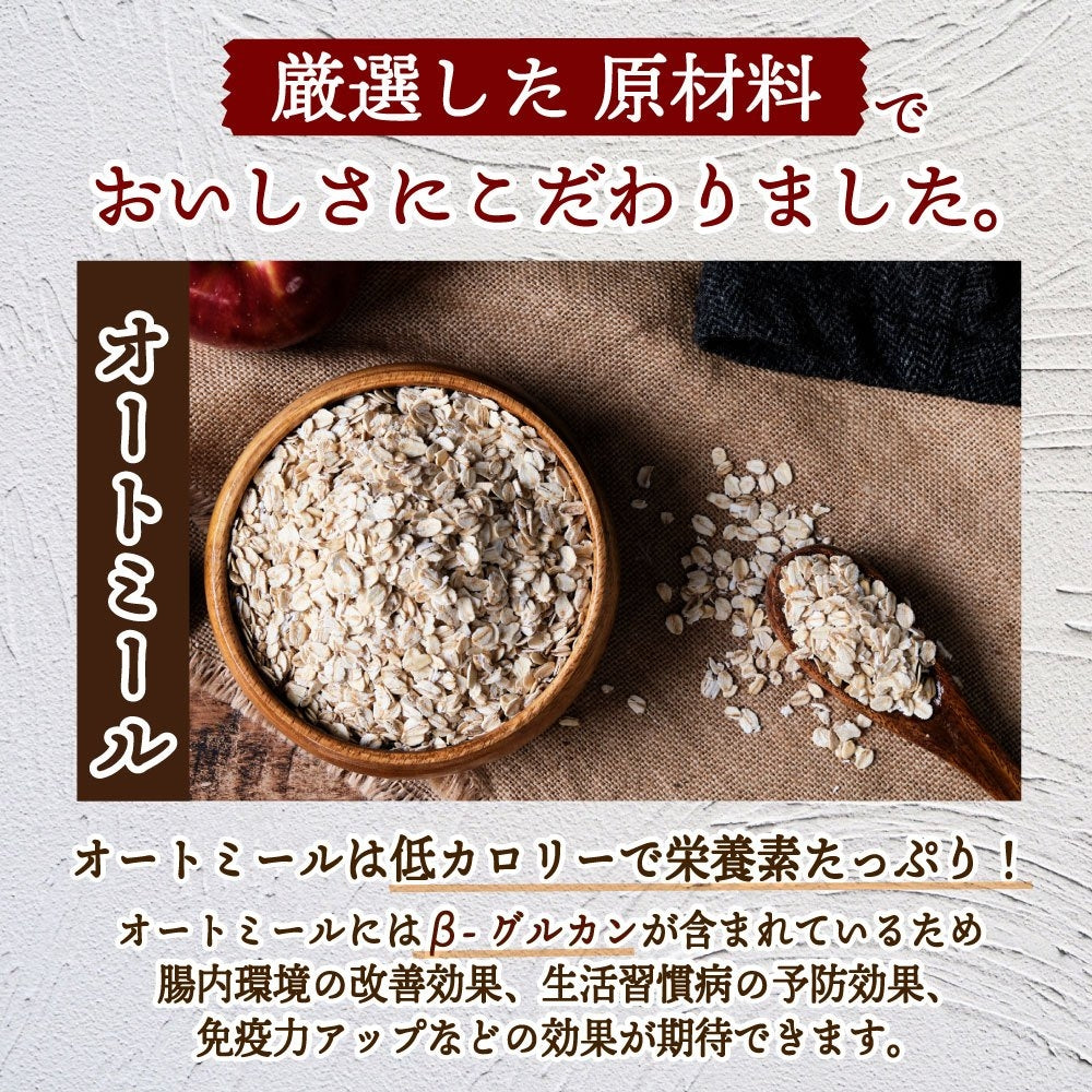 ・原材料/材質/素材:有機オートミール(オーストラリア産)、はちみつ、米粉、食用調合油(食用とうもろこし油、食用オリーブオイル)、くるみ、アーモンド、カシューナッツ、マカダミアナッツ、(一部にアーモンド、くるみ、カシューナッツを含む)